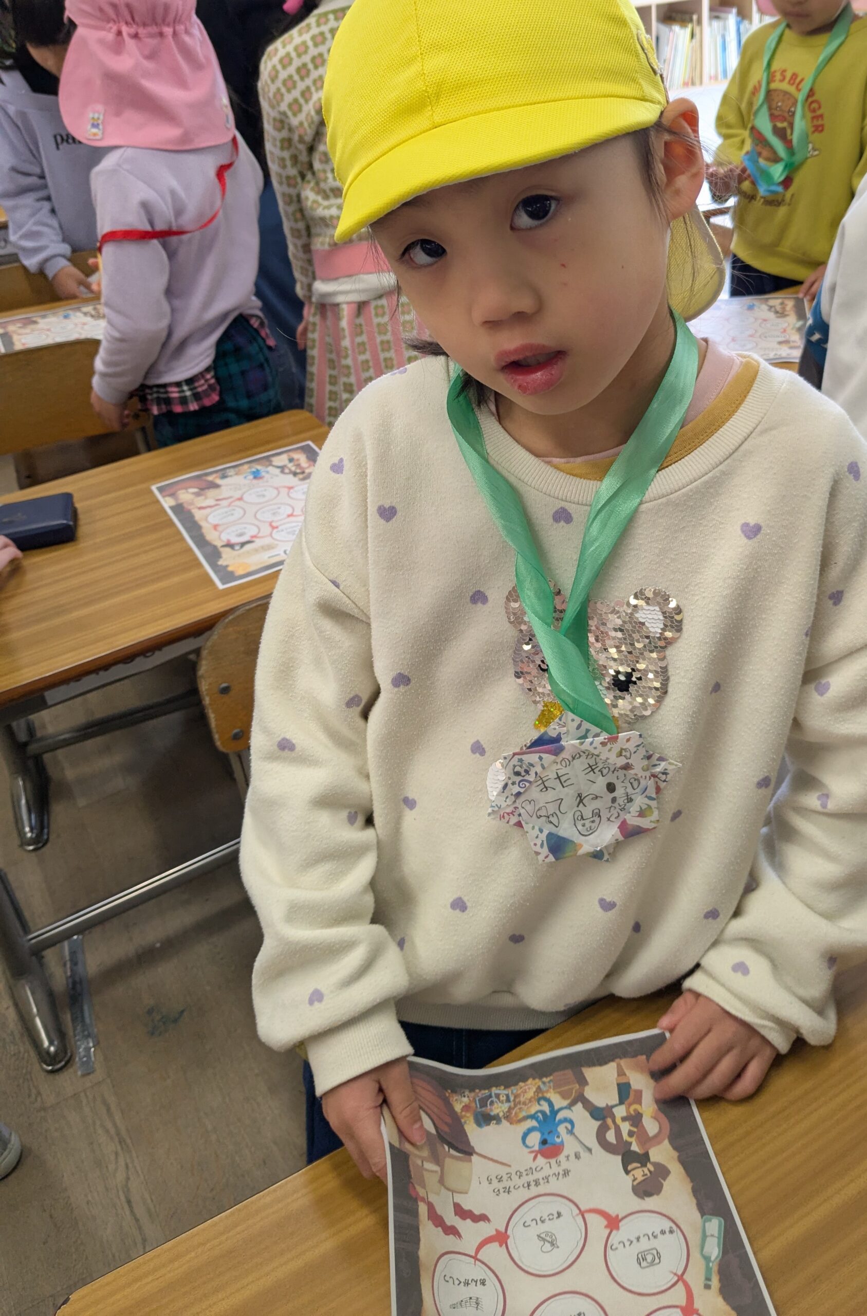探検のあとは1年2組のお部屋で鶴之荘幼稚園のお友だちと一緒にお話を聞きましたよ。