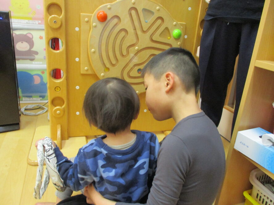 おひさまルームならではの異年齢同室。大きなお友達は小さなお友達に優しく接してくれてます。小さなお友達も、その優しさに安心して遊んでいました。