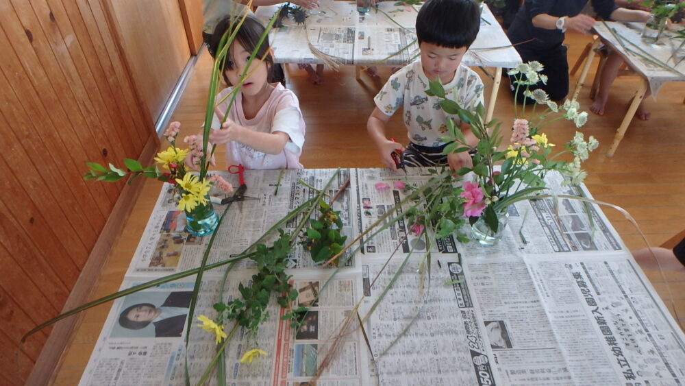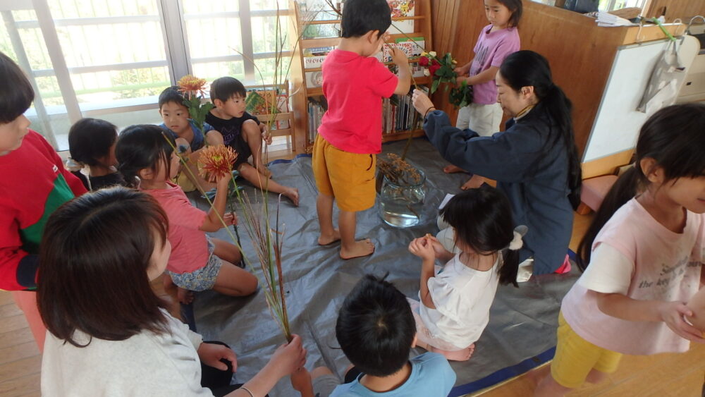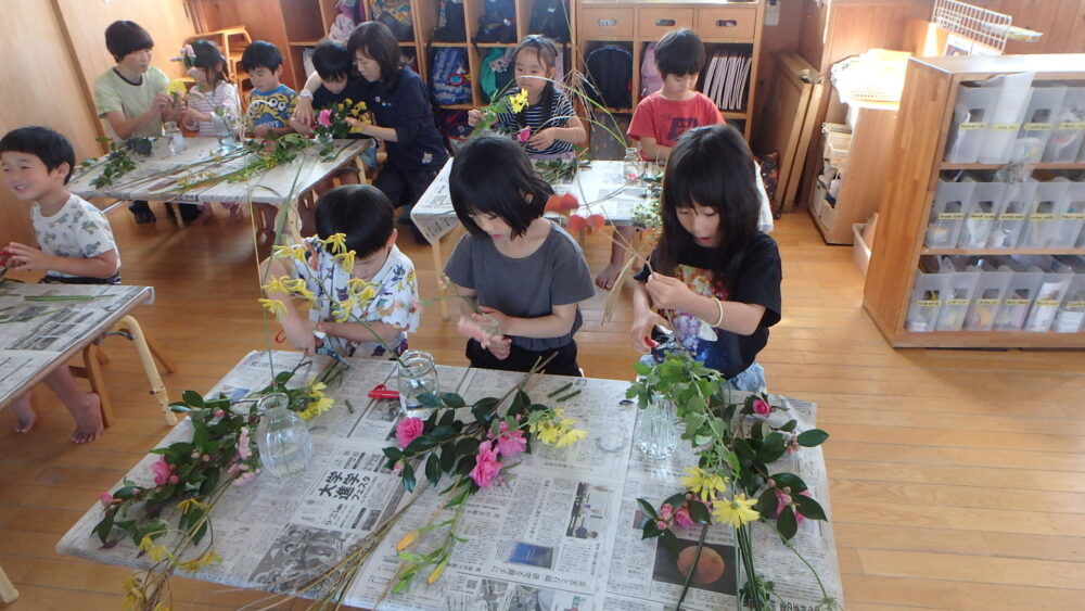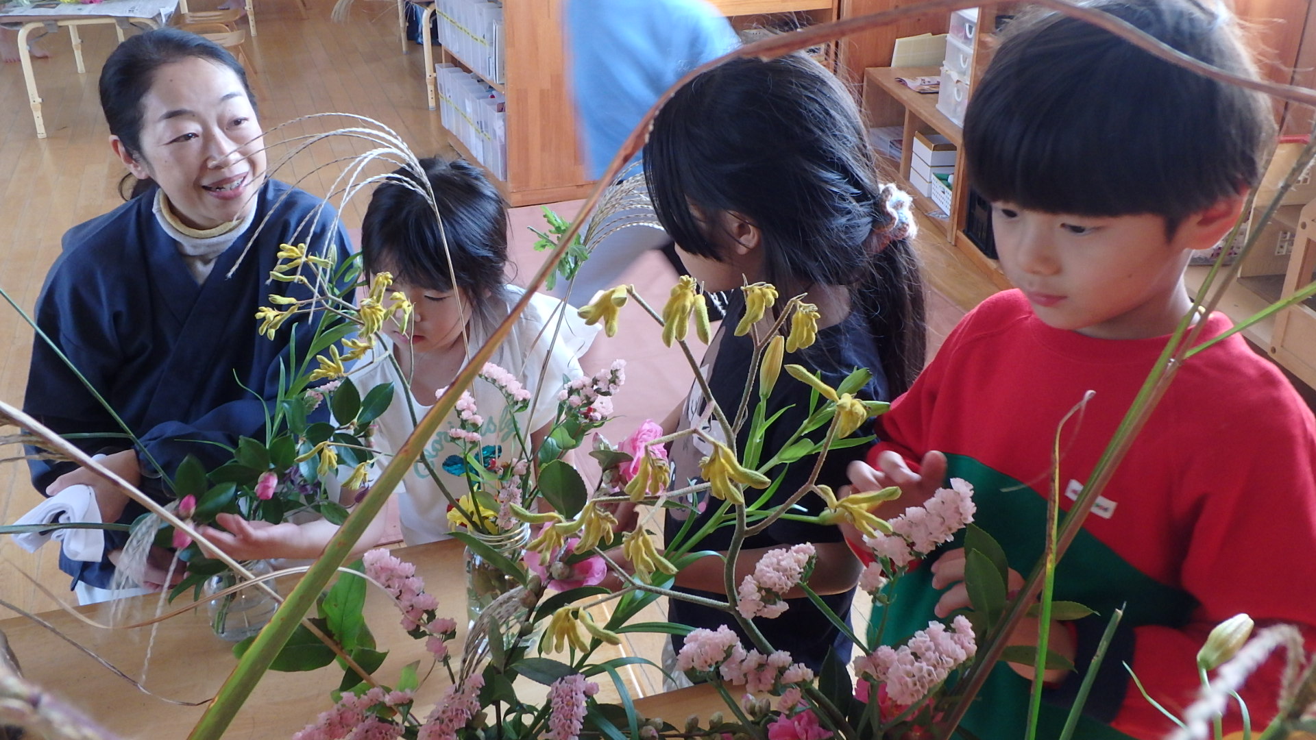 その人の事を思って生けてみようね」の言葉に真剣な表情の子どもたち。 思い思いに生けていましたよ。