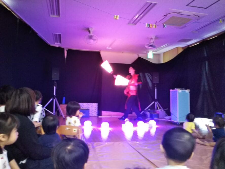光のショーは長く続きました。最後はてぶくろを使ってのおもしろい大道芸に子どもたちも