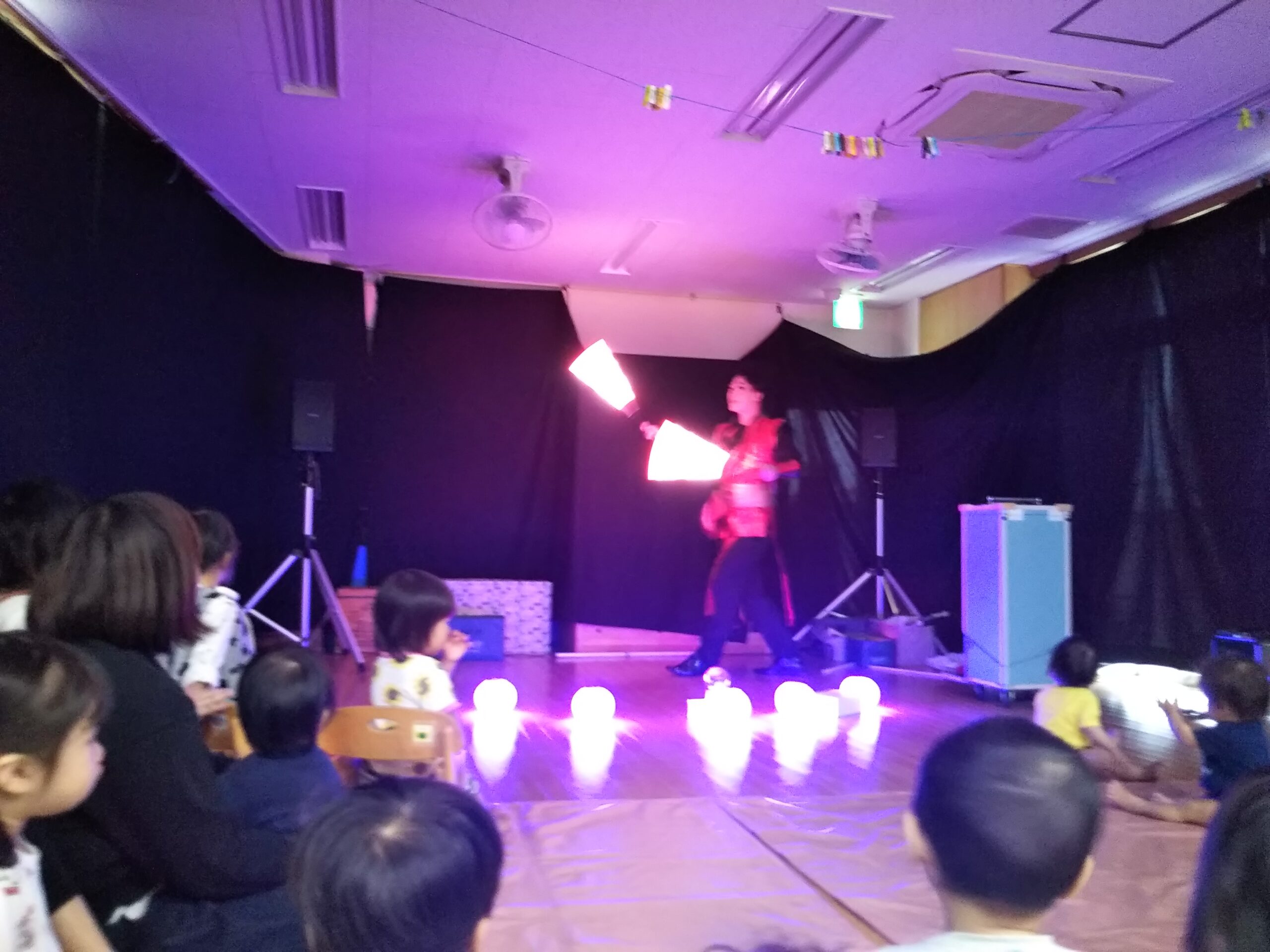 光のショーは長く続きました。最後はてぶくろを使ってのおもしろい大道芸に子どもたちも