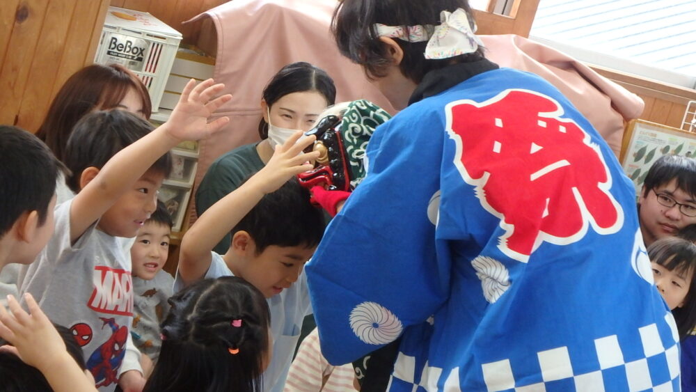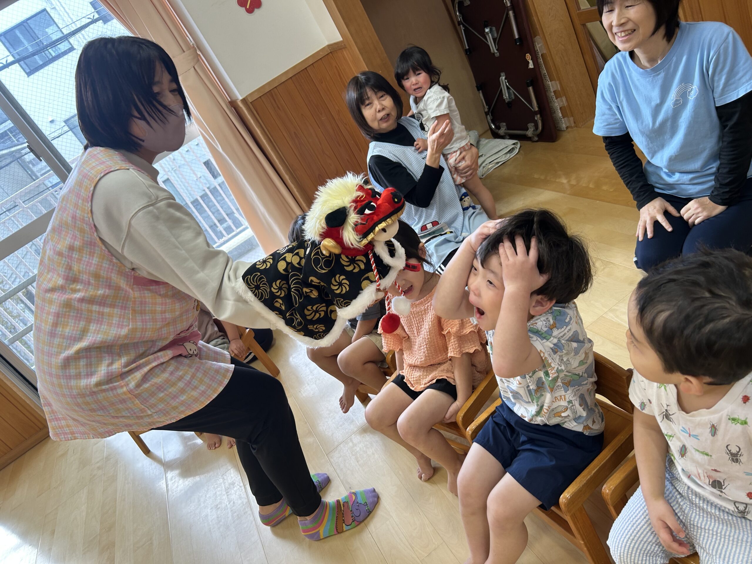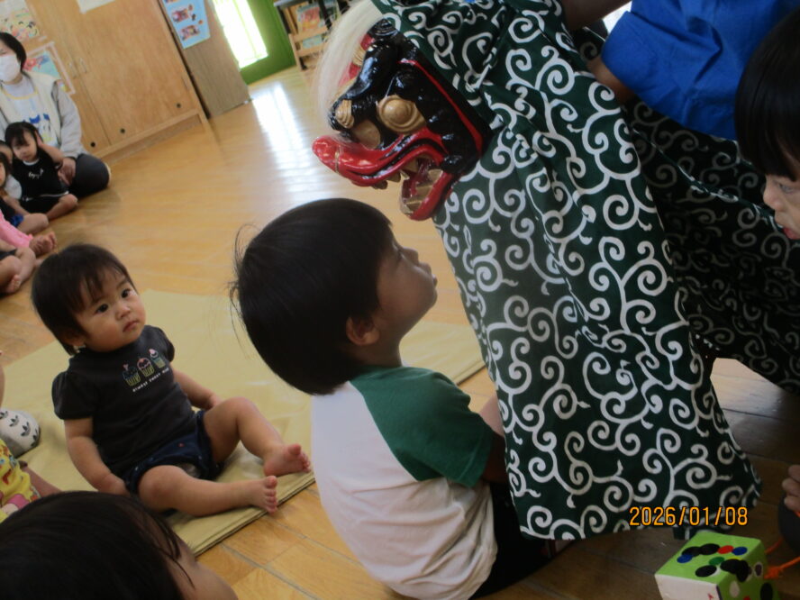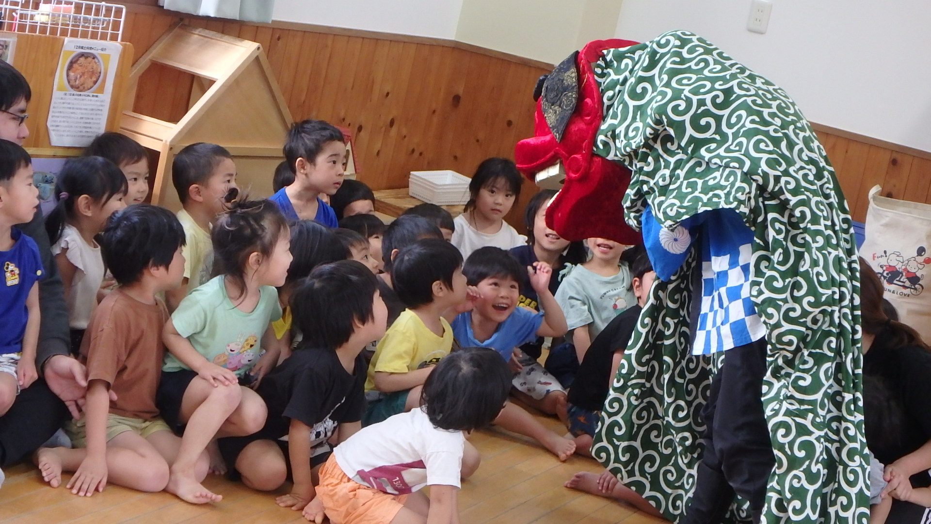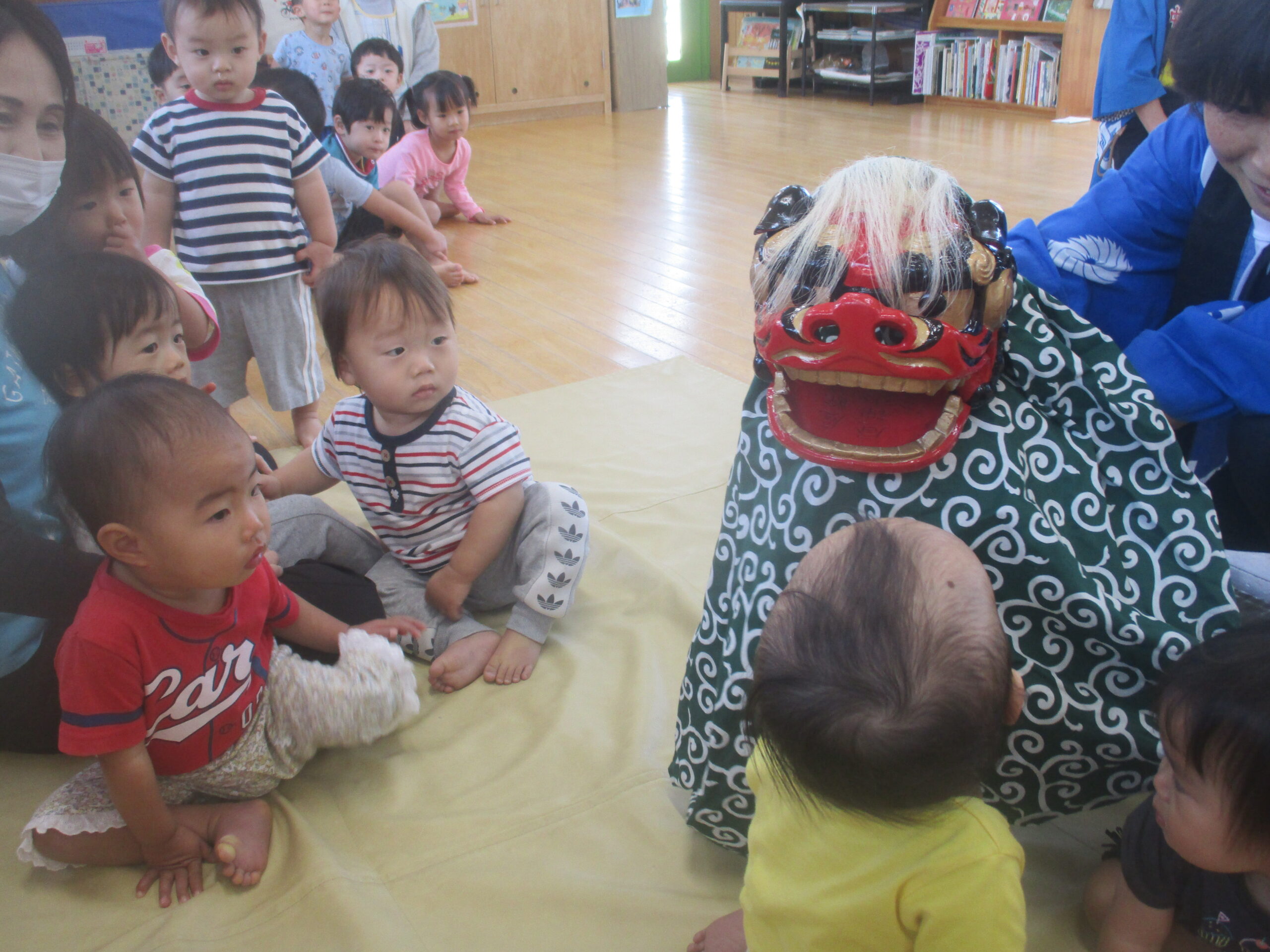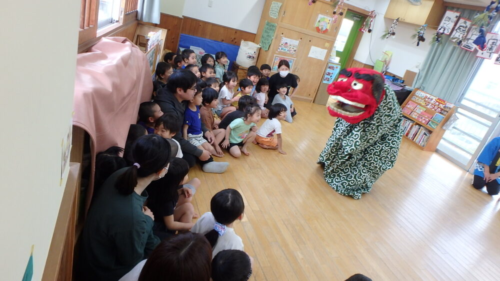 「ししまいさ~ん」の呼びかけに幼児クラスには大きなししまい登場!