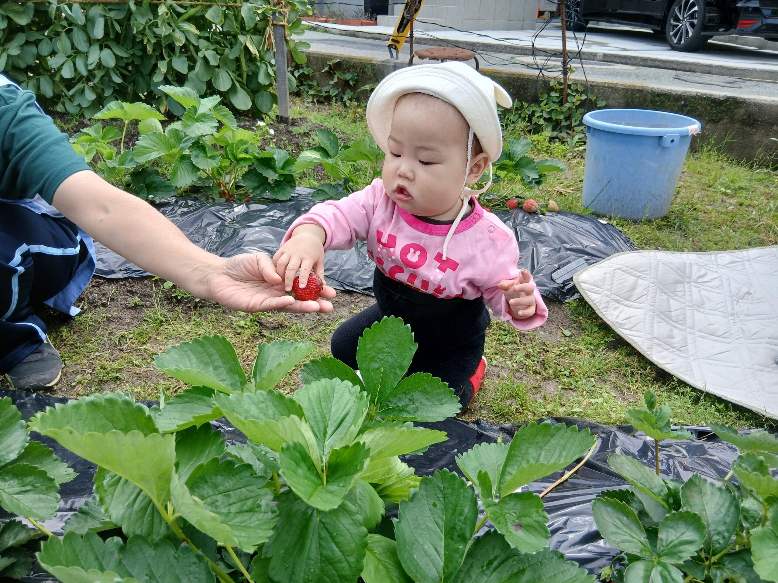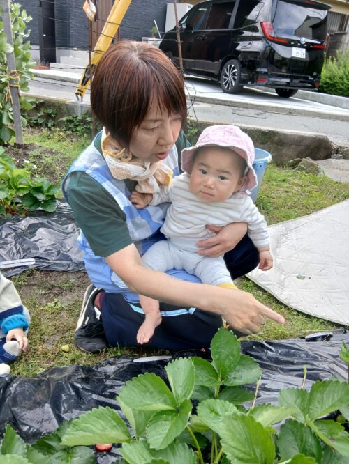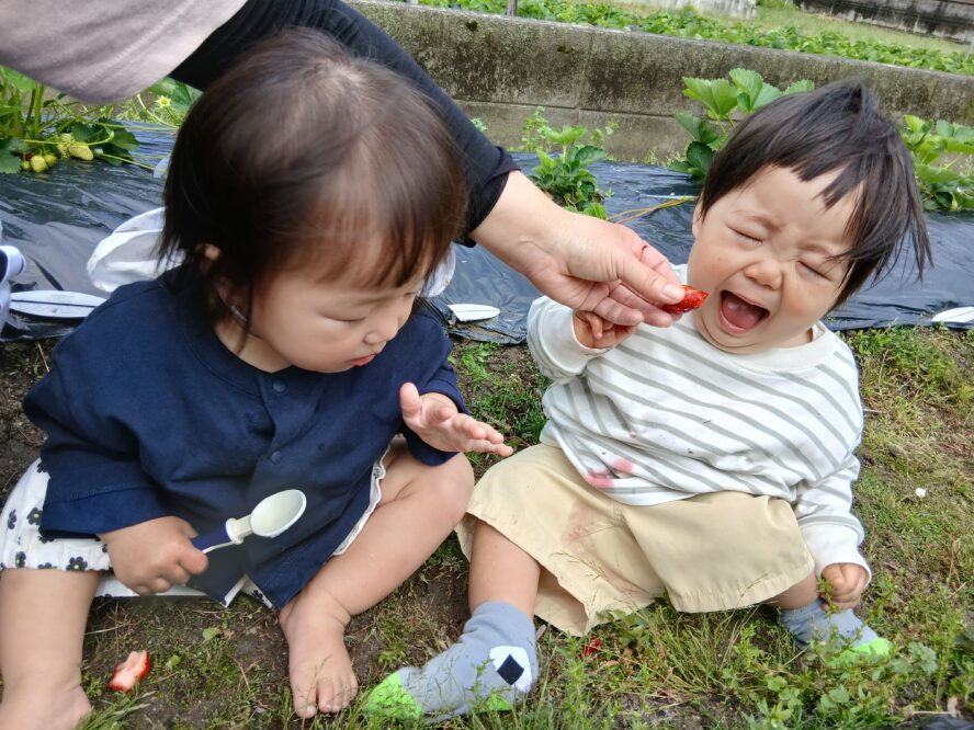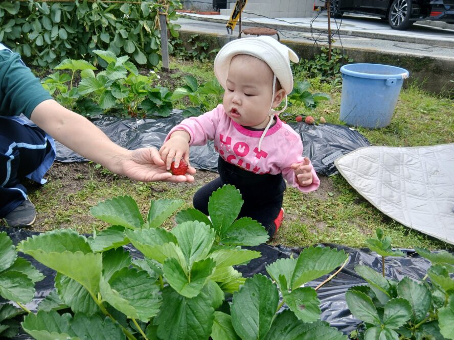 赤いいちごをみつけて、「はい、どーぞ」
